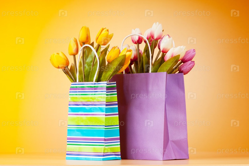 Бумажные пакеты с тюльпанами на желтом фоне