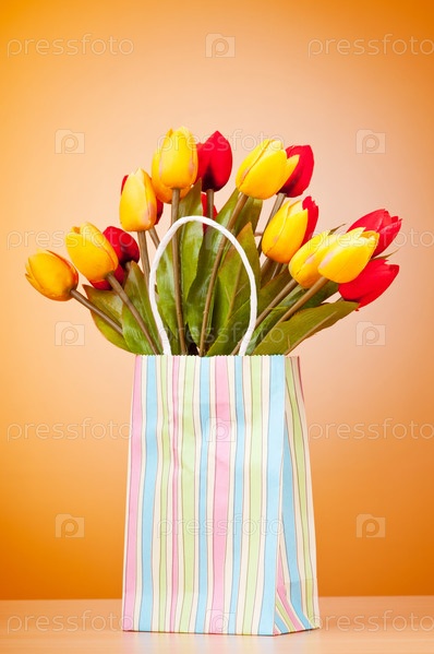 Подарочный пакет с цветами на оранжевом фоне
