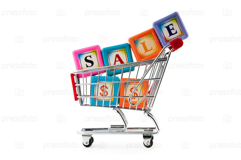 Корзина для покупок с кубиками, на которых написано 'SALE'