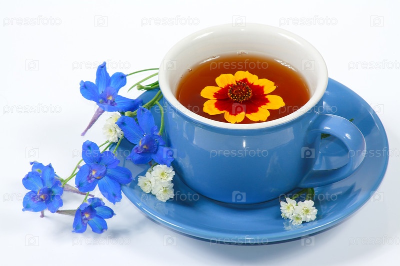 Чашка чая и голубые цветы на белом фоне