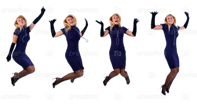 Красивая женщина прыгает от радости, изолированная на белом фоне