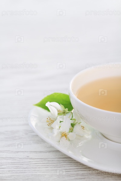 Чашка чая с белыми цветами на блюдце
