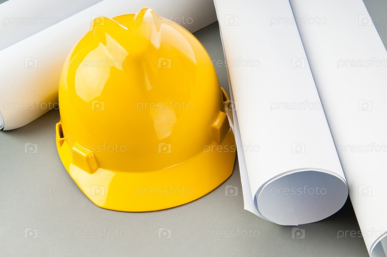 Желтая строительная каска и чертежи