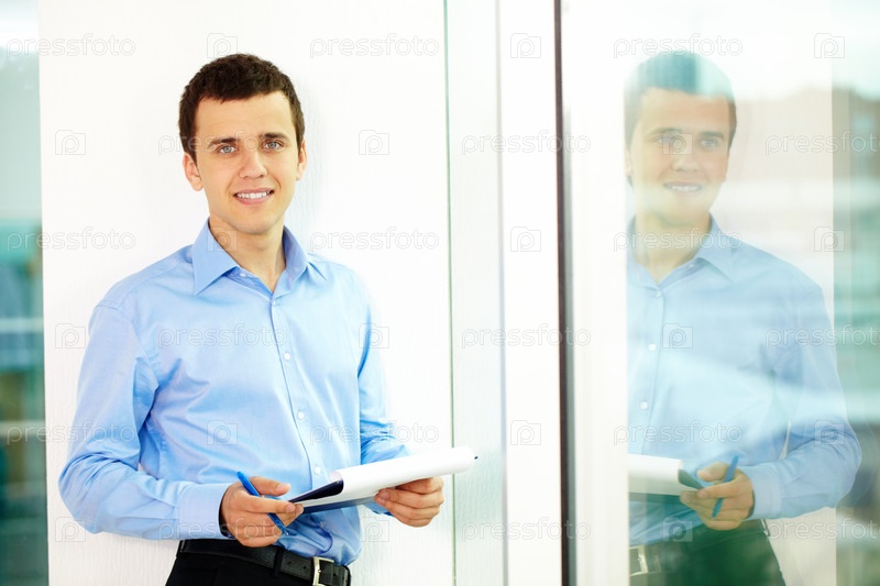 Улыбающийся бизнесмен с ручкой в руке