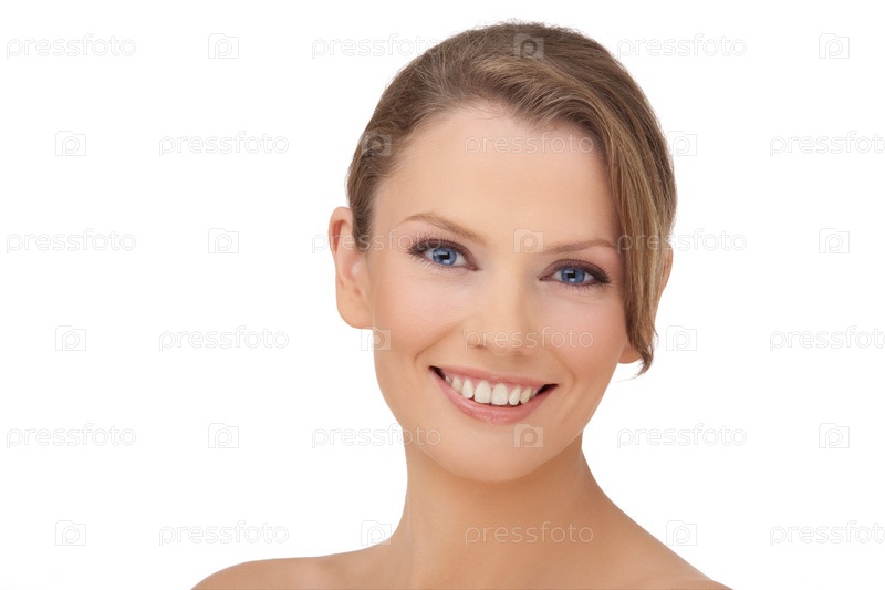 Счастливая женщина с голубыми глазами, на белом фоне