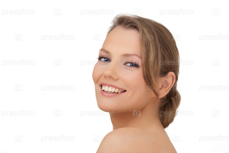 Счастливая женщина с голубыми глазами, на белом фоне