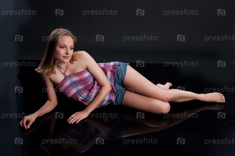 Молодая блондинка в чекированной рубашке на черном фоне