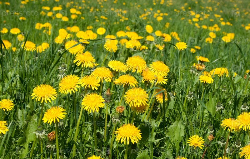 Желтые одуванчики в зеленой траве