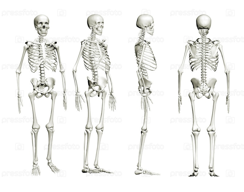 Скелет взрослого человека, вид с четырех сторон, 3D-изображение на белом фоне