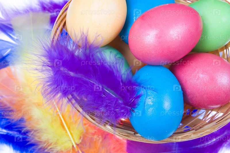Пасхальные цветные яйца в корзине с разноцветными перьями на белом фоне