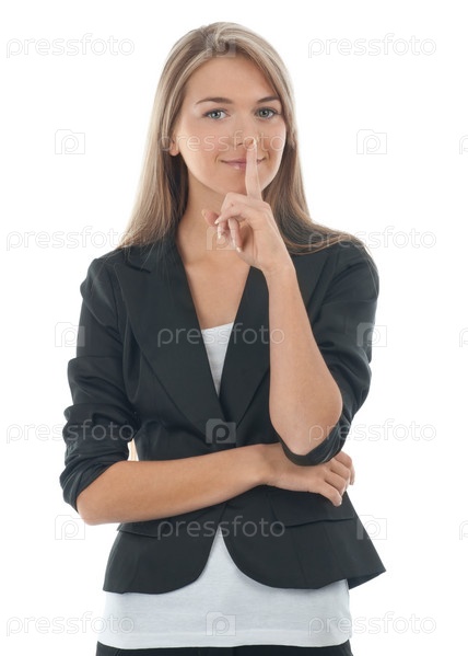 Молодая деловая женщина держит палец у губ на белом фоне