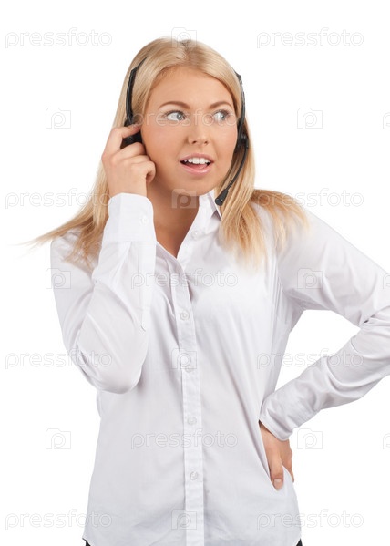 Удивленная девушка-оператор на белом фоне