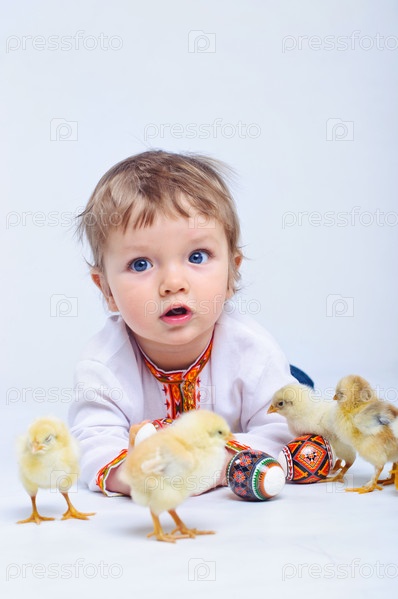 Маленький мальчик с цыплятами и пасхальными яйцами на белом фоне