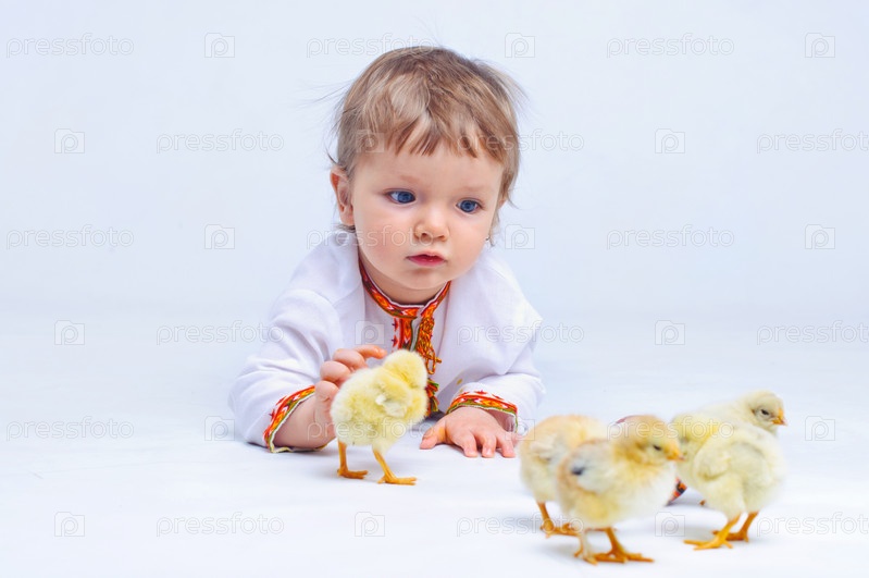 Маленький мальчик с цыплятами на белом фоне