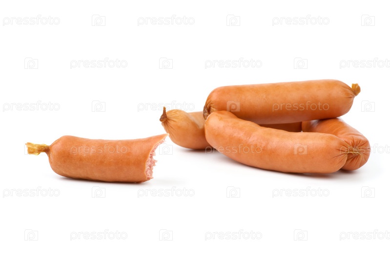 Несколько целых сосисок и частично съеденная сосиска на белом фоне