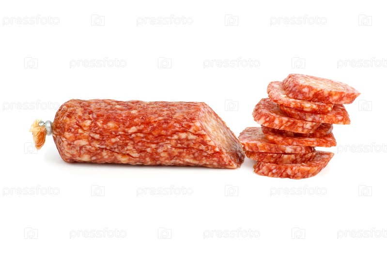 Половина колбасы салями и несколько ломтиков на белом фоне