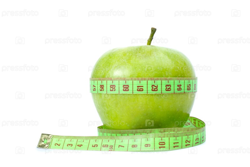 Концепция здорового питания и диеты, зеленое яблоко с мерной лентой на белом фоне