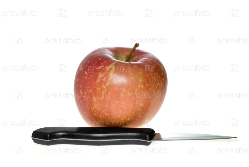 Красное яблоко и нож на белом фоне