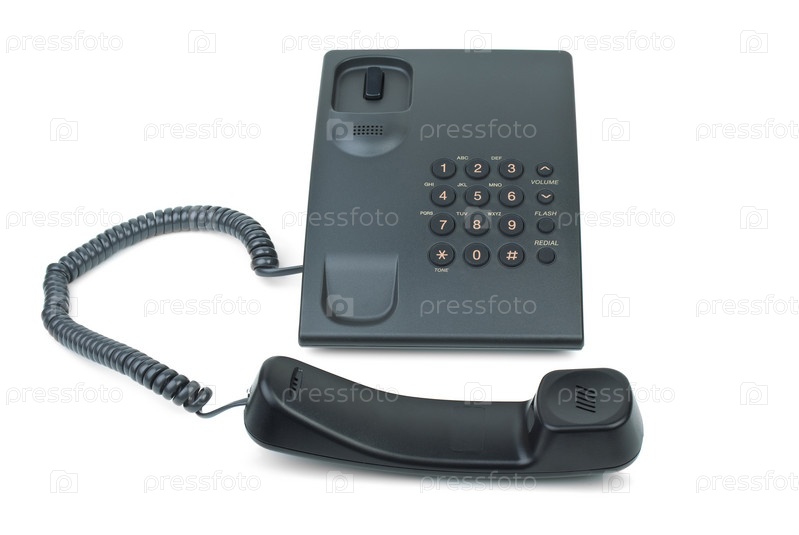 Черный телефонный аппарат со снятой трубкой на белом фоне