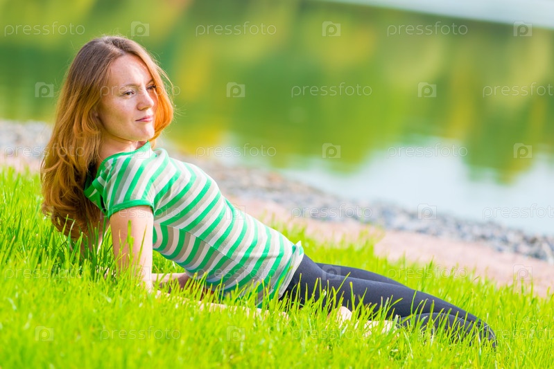 Девушка отдыхает на берегу озера