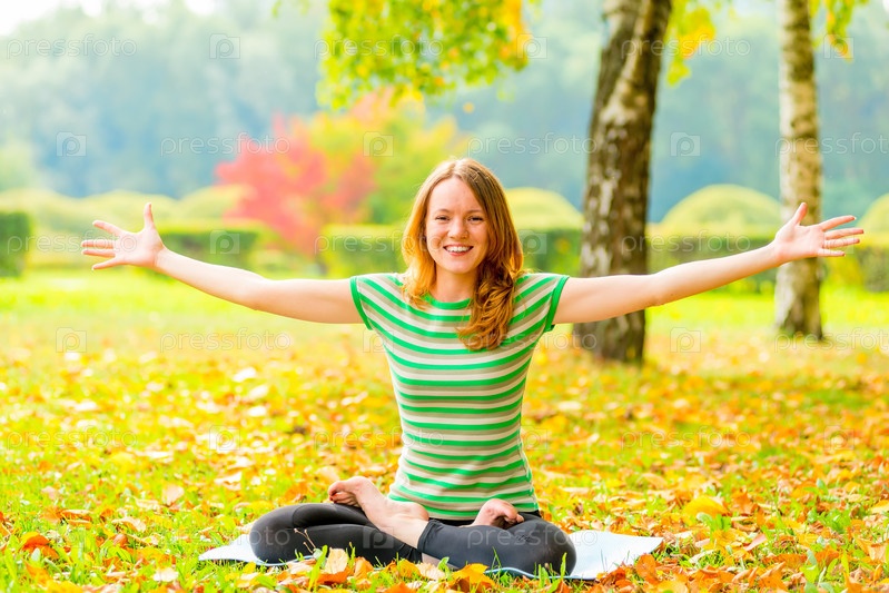 Девушка занимается йогой на траве