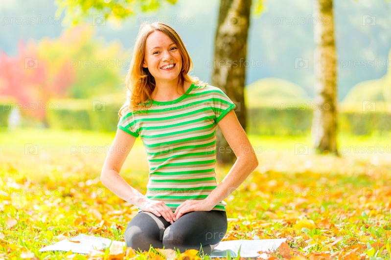 Девушка занимается йогой на траве