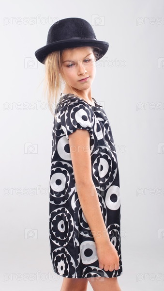 Красивая девушка в платье и шляпе на сером фоне