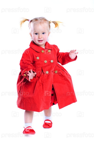 Симпатичная маленькая девочка в красном пальто на белом фоне