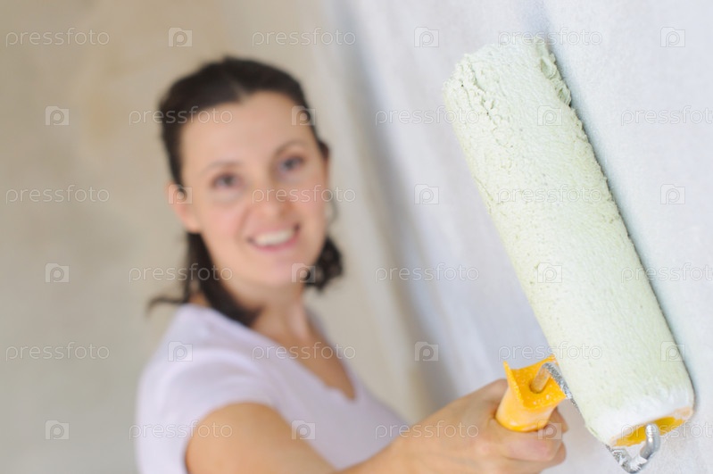 Молодая женщина красит стены валиком