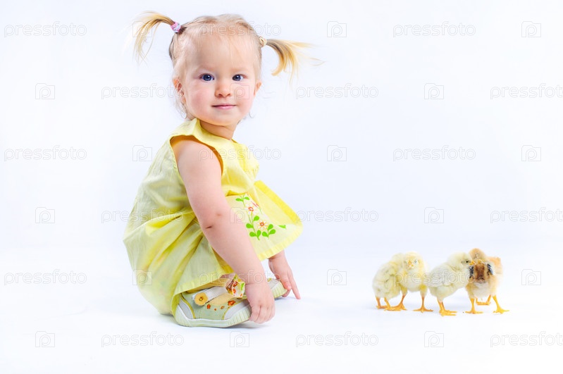 Симпатичная маленькая девочка в желтом платье с живыми цыплятами