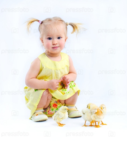 Симпатичная маленькая девочка в желтом платье с живыми цыплятами