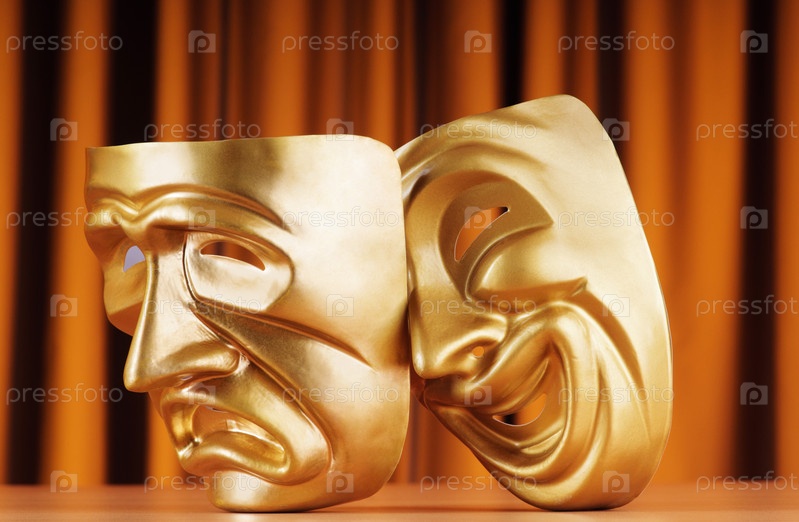 Две золотые маски на фоне занавеса