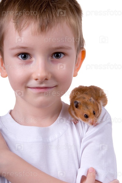 Мальчик с хомяком на белом фоне