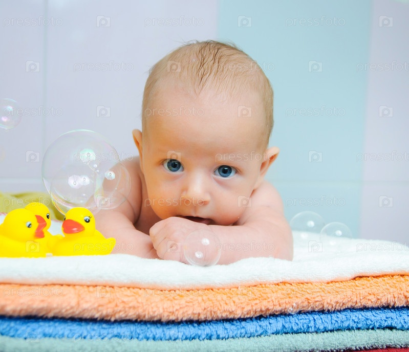 Маленький мальчик с мыльными пузырями лежит на полотенцах