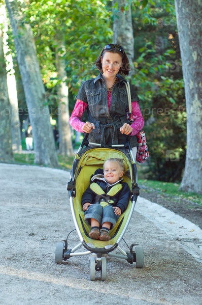 Мама с ребенком в коляске гуляет по парку