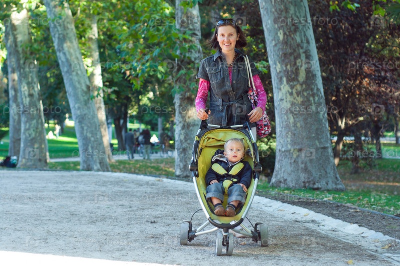 Мама с ребенком в коляске гуляет по парку