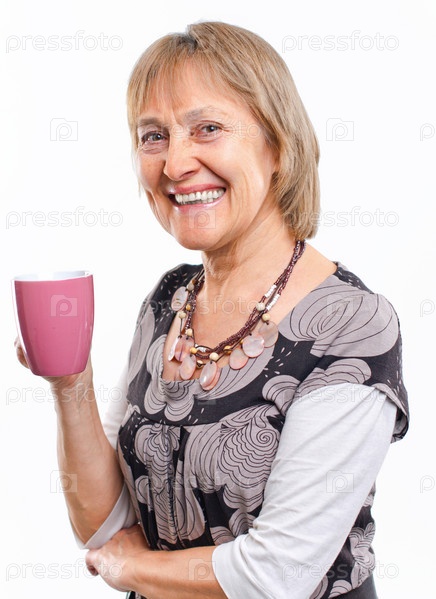 Счастливая пожилая женщина с кружкой в руке