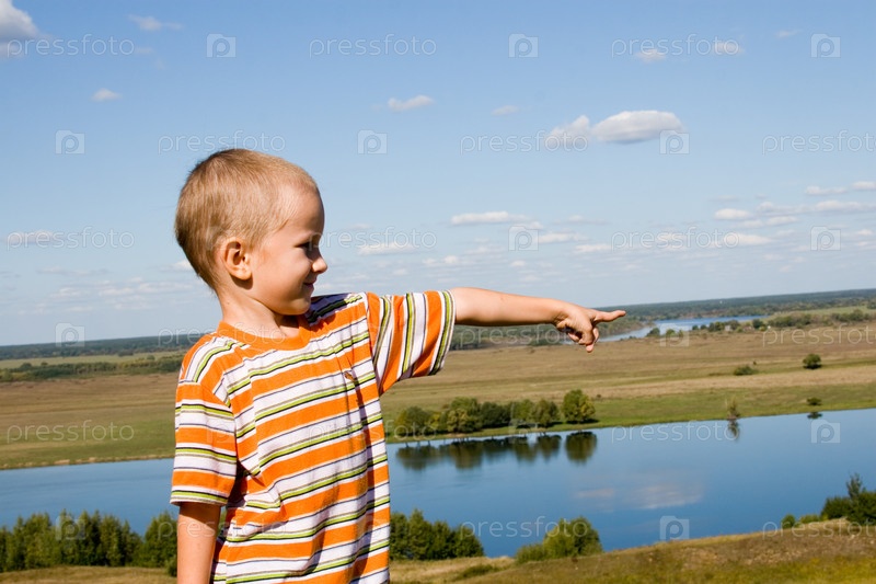 Мальчик стоит на берегу реки и показывает рукой в сторону