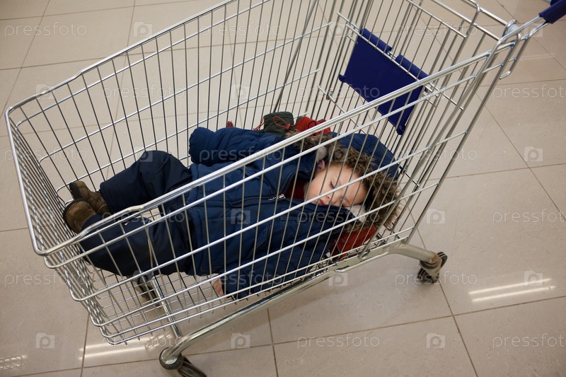 Маленький ребенок в корзине для покупок супермаркета
