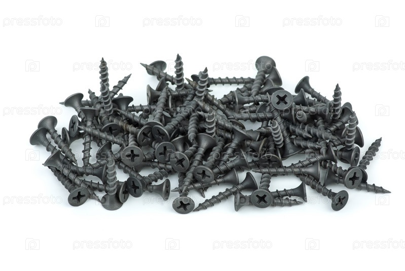 Горсть коротких шурупов для дерева на белом фоне