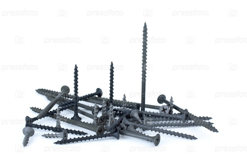 Стоящие и лежащие шурупы разного размера на белом фоне