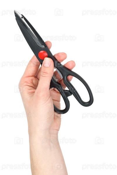 Рука, держащая кухонные ножницы, на белом фоне