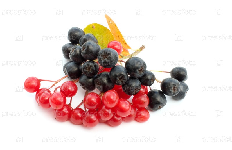 Кластеры ягод гульдер-розы и горного пепла на белом фоне
