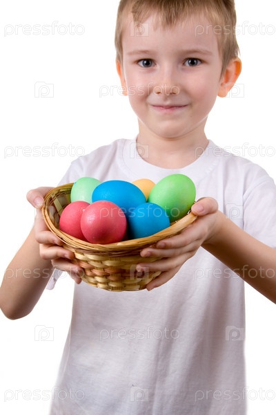 Мальчик с корзиной пасхальных яиц на белом фоне