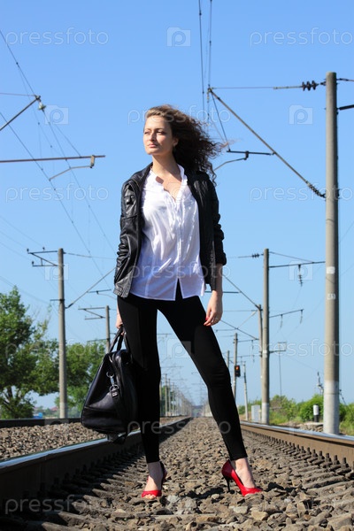 Девушка на железнодорожных путях в ожидании поезда