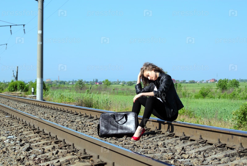 Девушка сидит на железнодорожных путях в ожидании поезда