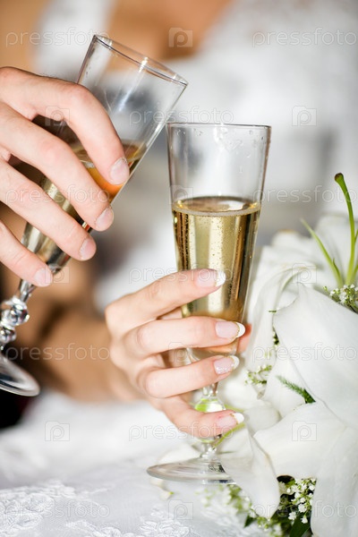 Молодожены с бокалами шампанского, крупным планом