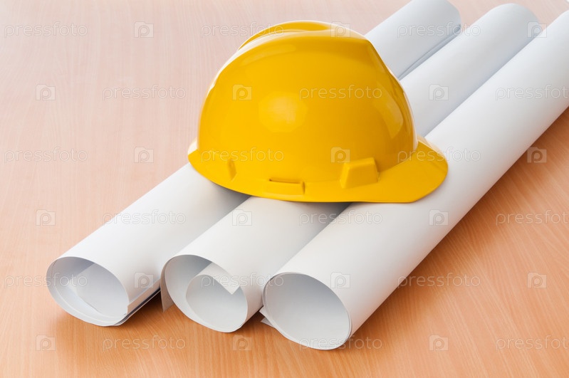 Желтая строительная каска и чертежи на столе