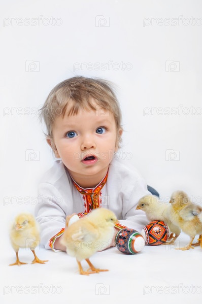 Симпатичный маленький мальчик с живыми цыплятами на сером фоне