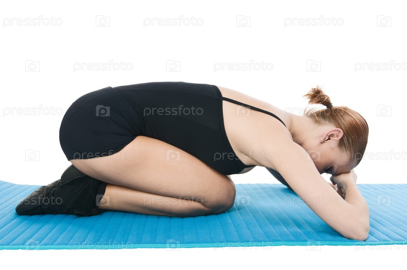 Девушка делает спортивные упражнения на синем коврике